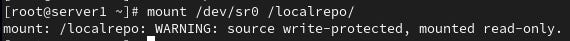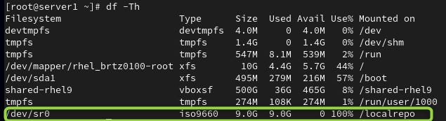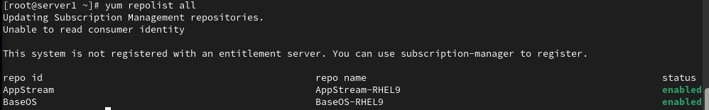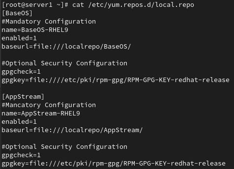 [root@server1 ~]# cat /etc/yum.repos.d/local.repo [BaseOS] #Mandatory Configuration name=BaseOS-RHEL9 enabled=1 baseurl=file:///localrepo/BaseOS/ #Optional Security Configuration gpgcheck=1 gpgkey=file:////etc/pki/rpm-gpg/RPM-GPG-KEY-redhat-release [AppStream] #Mancatory Configuration name=AppStream-RHEL9 enabled=1 baseurl=file:///localrepo/AppStream/ #Optional Security Configuration gpgcheck=1 gpgkey=file:///etc/pki/rpm-gpg/RPM-GPG-KEY-redhat-release